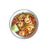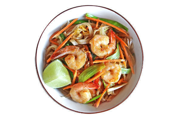 Nouilles sautées aux crevettes et légumes, sauce cacahuètes.
